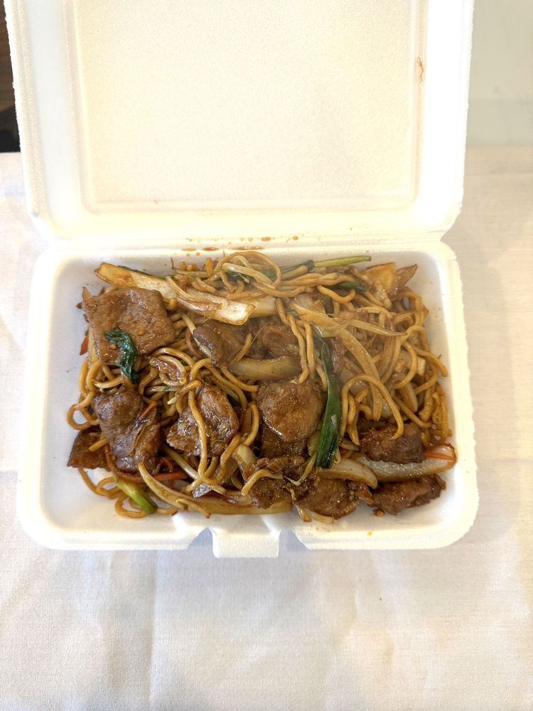 Beef soft noodles. Served with fried rice, 1 egg roll and 2 crabmeat cream cheese wontons.