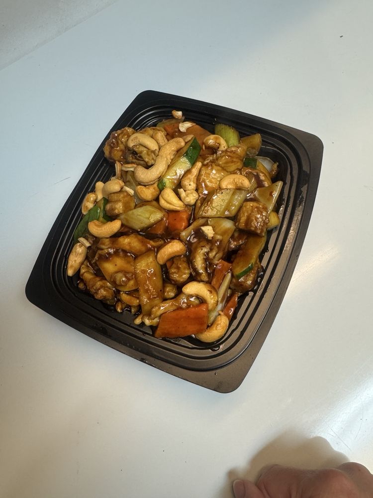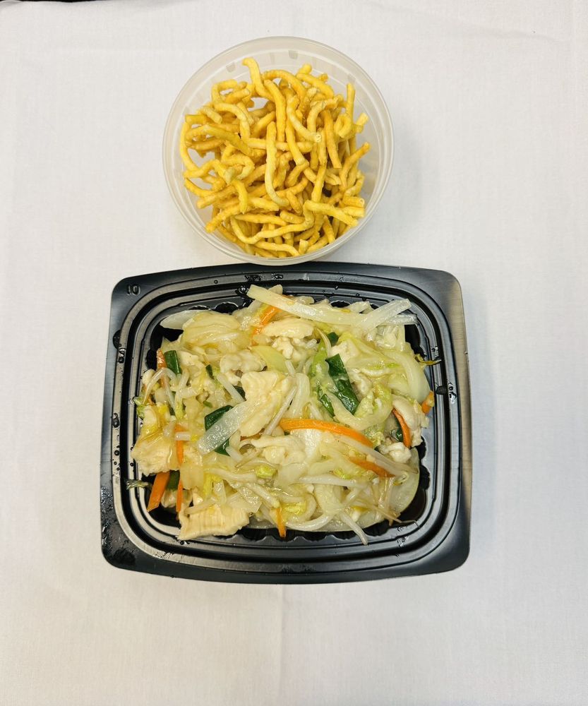 Chicken, veggies crispy noodles onside . Served with fried rice, 1 egg roll and 2 crabmeat cream cheese wontons.