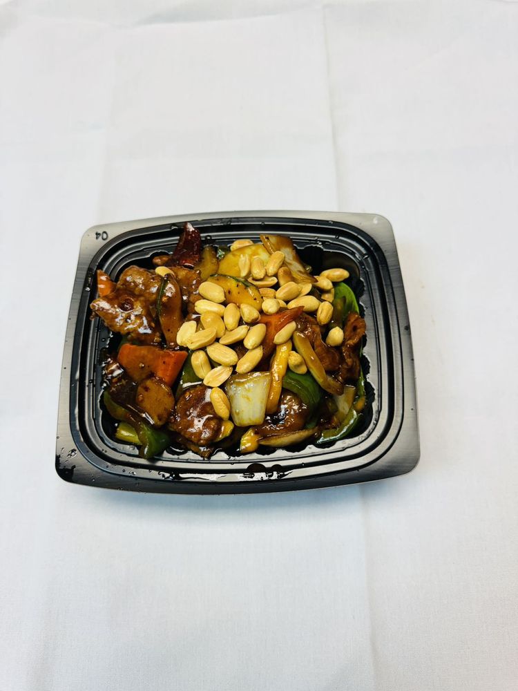 Spicy , Served with fried rice and your choice of 1 egg roll or 2 crab meat cream cheese wontons. Peanut on top