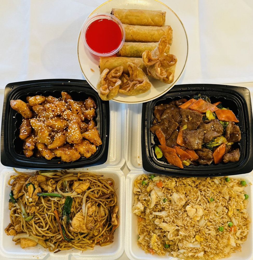 Beef, veggies crispy noodles onside , Served with fried rice, 1 egg roll and 2 crabmeat cream cheese wontons.