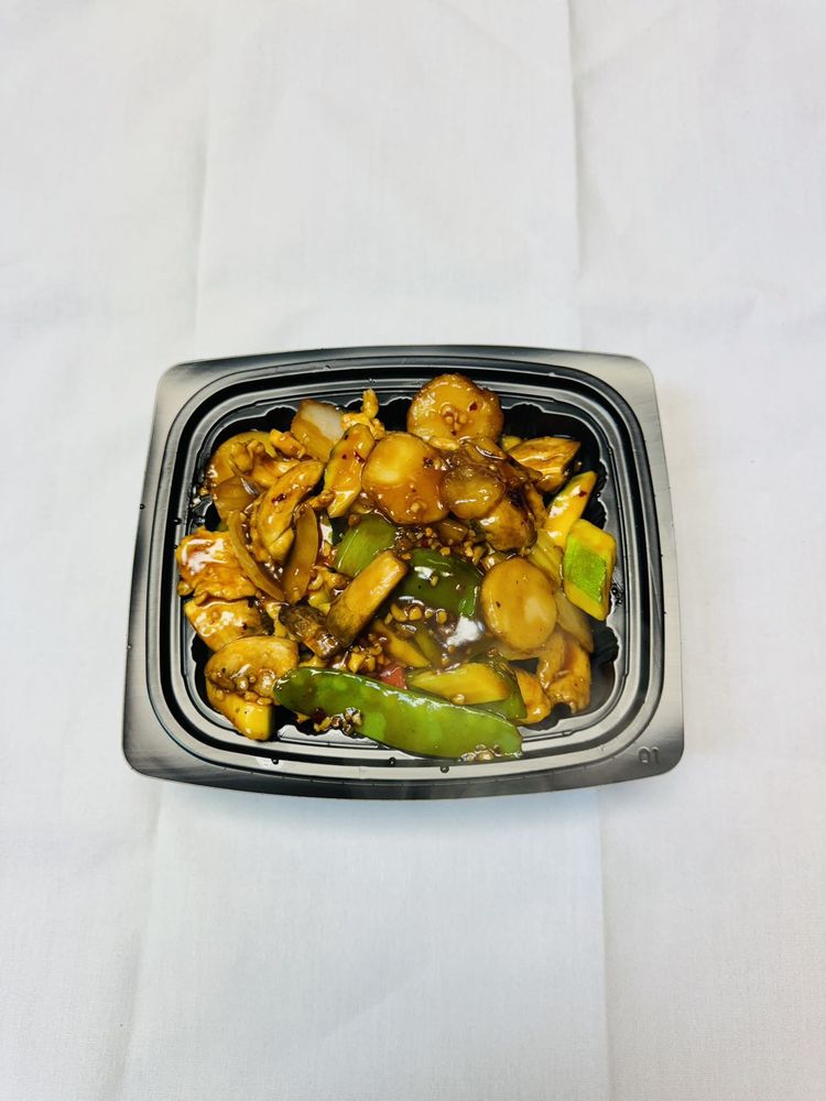 Spicy , Served with fried rice and your choice of 1 egg roll or 2 crab meat cream cheese wontons.