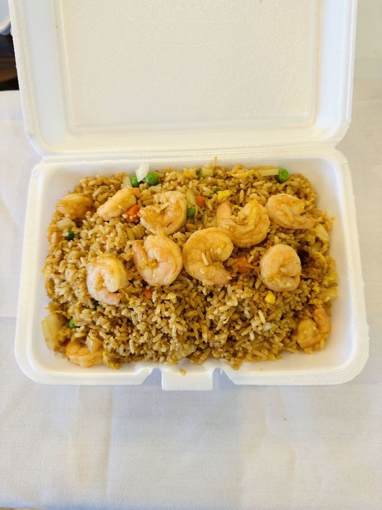 Shrimp, veggies crispy noodles onside , Served with fried rice, 1 egg roll and 2 crabmeat cream cheese wontons.