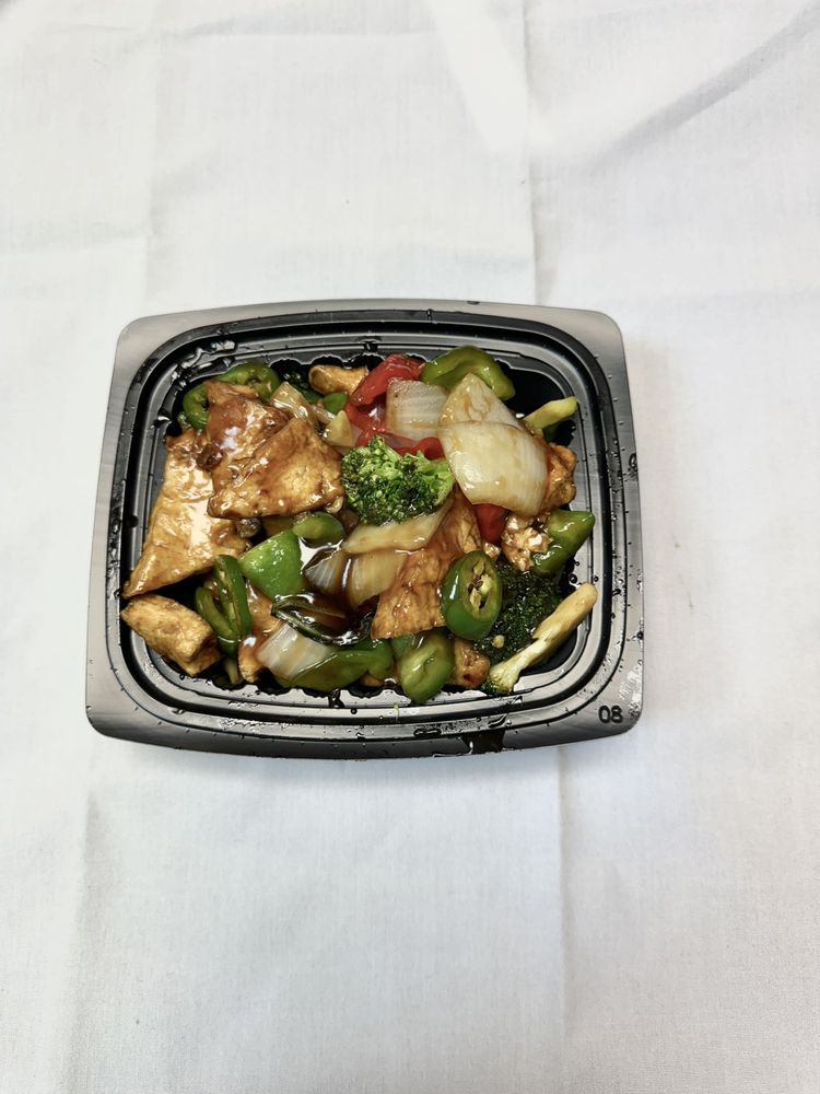 Veggies crispy noodles onside. Served with fried rice, 1 egg roll and 2 crabmeat cream cheese wontons.